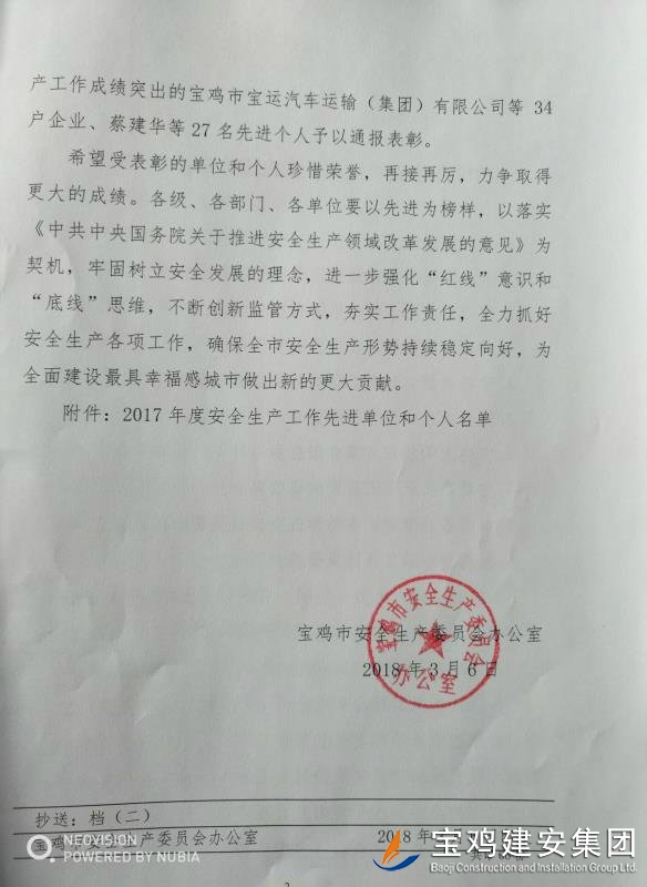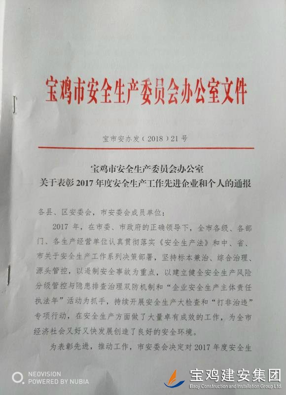 近期,寶雞市安委會(huì)對2017年度安全生產(chǎn)先進(jìn)單位進(jìn)行了通報(bào),我單位在考核中以優(yōu)異的成績獲得了此項(xiàng)殊榮。當(dāng)然,取得這樣的成績,離不開各級領(lǐng)導(dǎo)的正確決策和基層單位的艱辛付出,公司安委會(huì)在此表示感謝。 2017年,公司始終圍繞在國家的大政方針框架下,積極展開以《安全生產(chǎn)法》及相關(guān)規(guī)范標(biāo)準(zhǔn)為核心的安全工作,堅(jiān)持標(biāo)本兼治、綜合治理、源頭管控,以遏制安全事故為重點(diǎn),建立健全安全生產(chǎn)風(fēng)險(xiǎn)分級管控與隱患排查治理雙重機(jī)制,持續(xù)開展安全生產(chǎn)專項(xiàng)檢查,杜絕了惡性事故的發(fā)生。在安全生產(chǎn)標(biāo)準(zhǔn)化建設(shè)中,公司始終以“科技創(chuàng)新、合理投入、擇善而從”為出發(fā)點(diǎn)進(jìn)行部署管理,通過系統(tǒng)管理及一系列舉措,使公司安全管理走在本土行業(yè)前列,且在多次檢查驗(yàn)收中,獲得省、市級領(lǐng)導(dǎo)的點(diǎn)贊。 九牛一毫莫自夸 驕傲自滿必翻車,成績只代表過去,2018年,我們要完善不足,戒驕戒躁,砥礪前行。 寶雞建安集團(tuán)股份有限公司安委會(huì) 2018年4月25日