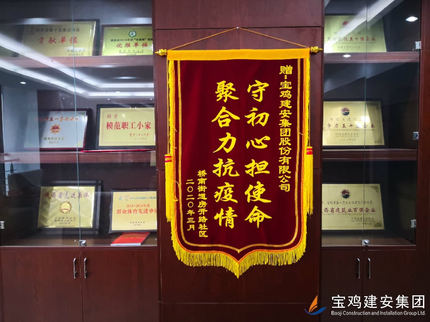 4月1日上午,寶雞建安大廈21樓舉行了一場簡單而熱烈的贈(zèng)旗活動(dòng)。橋南街道辦事處房開路社區(qū)馮書記、王主任等三人代表社區(qū)所管轄的廣大居民,給寶雞建安集團(tuán)股份有限公司送來一面“守初心擔(dān)使命、聚合力抗疫情”的錦旗,贊揚(yáng)寶雞建安集團(tuán)公司在新冠肺炎疫情防控工作中對(duì)社區(qū)工作的支持和幫助。公司黨委書記、總經(jīng)理、工會(huì)主席等參加活動(dòng)。