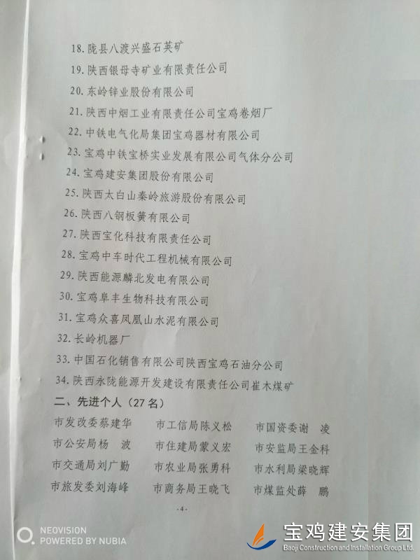 近期,寶雞市安委會(huì)對2017年度安全生產(chǎn)先進(jìn)單位進(jìn)行了通報(bào),我單位在考核中以優(yōu)異的成績獲得了此項(xiàng)殊榮。當(dāng)然,取得這樣的成績,離不開各級領(lǐng)導(dǎo)的正確決策和基層單位的艱辛付出,公司安委會(huì)在此表示感謝。 2017年,公司始終圍繞在國家的大政方針框架下,積極展開以《安全生產(chǎn)法》及相關(guān)規(guī)范標(biāo)準(zhǔn)為核心的安全工作,堅(jiān)持標(biāo)本兼治、綜合治理、源頭管控,以遏制安全事故為重點(diǎn),建立健全安全生產(chǎn)風(fēng)險(xiǎn)分級管控與隱患排查治理雙重機(jī)制,持續(xù)開展安全生產(chǎn)專項(xiàng)檢查,杜絕了惡性事故的發(fā)生。在安全生產(chǎn)標(biāo)準(zhǔn)化建設(shè)中,公司始終以“科技創(chuàng)新、合理投入、擇善而從”為出發(fā)點(diǎn)進(jìn)行部署管理,通過系統(tǒng)管理及一系列舉措,使公司安全管理走在本土行業(yè)前列,且在多次檢查驗(yàn)收中,獲得省、市級領(lǐng)導(dǎo)的點(diǎn)贊。 九牛一毫莫自夸 驕傲自滿必翻車,成績只代表過去,2018年,我們要完善不足,戒驕戒躁,砥礪前行。 寶雞建安集團(tuán)股份有限公司安委會(huì) 2018年4月25日