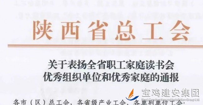 另據(jù)消息,在第28個(gè)“世界讀書日”到來之際,由市總工會(huì)推薦的全市職工讀書活動(dòng)兩個(gè)代表家庭,被陜西省總工會(huì)授予全省優(yōu)秀單位稱號(hào),寶雞建安集團(tuán)工會(huì)成為代表全市職工讀書活動(dòng)中的典型表率之一,受到全省通報(bào)嘉獎(jiǎng),為寶雞贏得了榮譽(yù)。